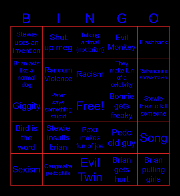 This bingo card has a free space and 24 words: Stewie insults brian, Qaugmaire pedophila, Racism, Sexism, Flashback, Stewie uses an invention, Brian acts like a normal dog, Shut up meg, Bonnie gets freaky, Peter makes fun of joe, They make fun of a celebrity, Giggity, Pedo old guy, Song, Random Violence, Brian gets hurt, Stewie tries to kill someone, Talking animal (not brian), Refrences a show/movie, Peter says something stupid, Brian pulling girls, Bird is the word, Evil Monkey and Evil Twin.