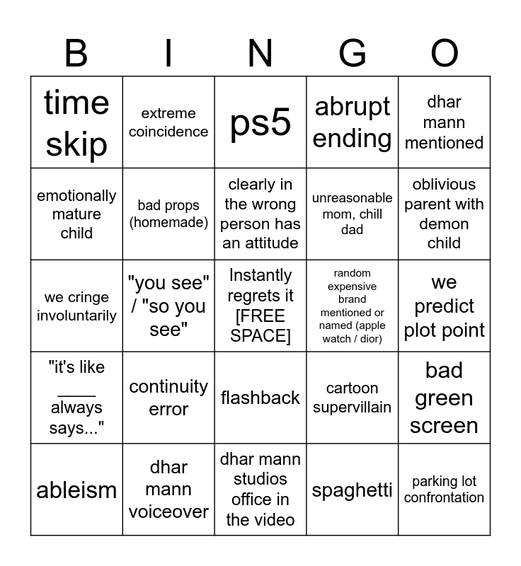 This bingo card has a free space and 30 words: dhar mann voiceover, dhar car, "you see" / "so you see", merch in video, time skip, ps5, bad props (homemade), flashback, random expensive brand mentioned or named (apple watch / dior), dhar mann studios office in the video, we predict plot point, parking lot confrontation, spaghetti, creep behavior, oblivious parent with demon child, kids with ipad, cartoon supervillain, "it's like ____ always says...", continuity error, dhar mann mentioned, we cringe involuntarily, someone fired over something small, extreme coincidence, unreasonable mom, chill dad, emotionally mature child, abrupt ending, bad green screen, ableism, clearly in the wrong person has an attitude and chekov's _______.