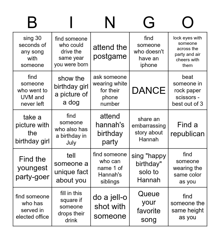 This bingo card has a free space and 29 words: find someone who has served in elected office, find the oldest party-goer, find someone who also has a birthday in July, pet a brunette, sing 30 seconds of any song with someone, attend the postgame, show the birthday girl a picture of a dog, tell someone a unique fact about you, share an embarrassing story about Hannah, fill in this square if someone drops their drink, Find a republican, find someone the same height as you, do a jell-o shot with someone, Queue your favorite song, beat someone in rock paper scissors - best out of 3, take a candid picture of someone text it to Hannah, find someone who can name 1 of Hannah's siblings, Find the youngest party-goer, lock eyes with someone across the party and air cheers with them, take a picture with the birthday girl, sing "happy birthday" solo to Hannah, find someone with the same zodiac sign as you, DANCE, find someone who went to UVM and never left, find someone who doesn't have an iphone, find someone who could drive the same year you were born, find someone wearing the same color as you, ask someone wearing white for their phone number and find someone who was born the same year you could drive.