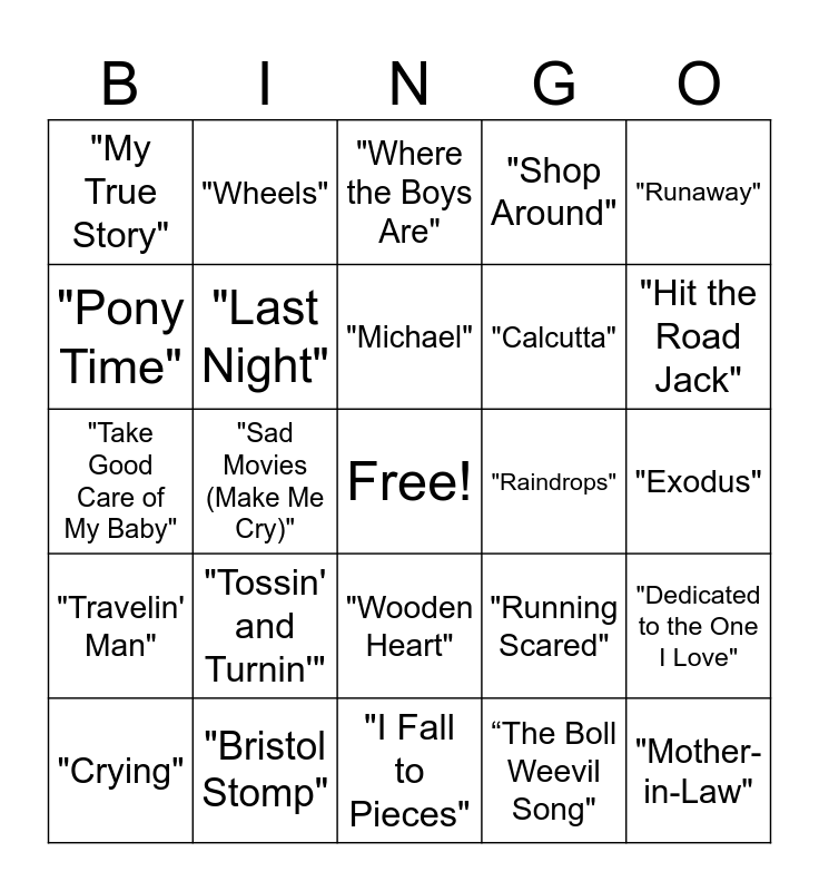 This bingo card has a free space and 25 words: "Tossin' and Turnin'", "I Fall to Pieces", "Michael", "Crying", "Runaway", "My True Story", "Pony Time", "Wheels", "Raindrops", "Wooden Heart", "Calcutta", "Take Good Care of My Baby", "Running Scared", "Dedicated to the One I Love", "Last Night", "Will You Love Me Tomorrow", "Exodus", "Where the Boys Are", "Hit the Road Jack", "Sad Movies (Make Me Cry)", "Mother-in-Law", "Bristol Stomp", "Travelin' Man", "Shop Around" and “The Boll Weevil Song".