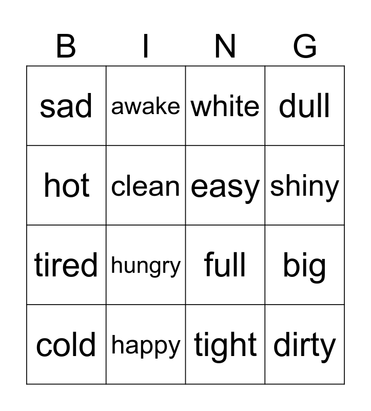 This bingo card has 20 words: big, small, white, black, cold, hot, happy, sad, tired, awake, hungry, full, clean, dirty, easy, hard, shiny, dull, tight and loose.
