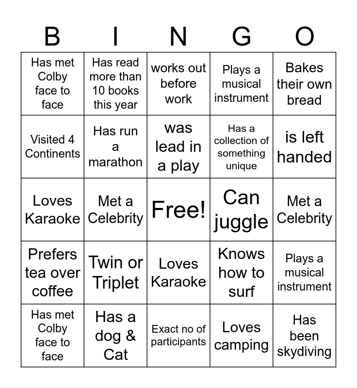 This bingo card has a free space and 74 words: Screams during Scary movies, built an ikea furniture correctly 1st time, works out before work, Exact no of participants, Has a dog & Cat, Carpools, Has worked for agency for more than 6 yrs, Sends Christmas cards, Has met Colby face to face, Has a nickname, Twin or Triplet, Percentage in TPOS, was lead in a play, Visited 4 Continents, Ride Horses, Met a Celebrity, Traveled to Perth via Car, is left handed, Worked as bartender, Loves Karaoke, Has run a marathon, Has read more than 10 books this year, Plays a musical instrument, Has a collection of something unique, Has been skydiving, Prefers tea over coffee, Wakes up before 5 AM regularly, Can juggle, Has appeared on TV, Is a twin, Bakes their own bread, Knows how to surf, Can solve a Rubik's cube, Practices yoga, Has climbed a mountain, Loves camping, Knows sign language, Screams during Scary movies, built an ikea furniture correctly 1st time, Works out before work, Exact no of participants, Has a dog & Cat, Carpools, Has worked for NDIA for more than 6 yrs, Sends Christmas cards, Has met Colby face to face, Has a nickname, Twin or Triplet, Percentage in TPOS, Was lead in a play, Visited 4 Continents, Ride Horses, Met a Celebrity, Traveled to Perth via Car, Is left handed, Worked as bartender, Loves Karaoke, Has run a marathon, Has read more than 10 books this year, Plays a musical instrument, Has a collection of something unique, Has been skydiving, Prefers tea over coffee, Wakes up before 5 AM regularly, Can juggle, Has appeared on TV, Is a twin, Bakes their own bread, Knows how to surf, Can solve a Rubik's cube, Practices yoga, Has climbed a mountain, Loves camping and Knows sign language.