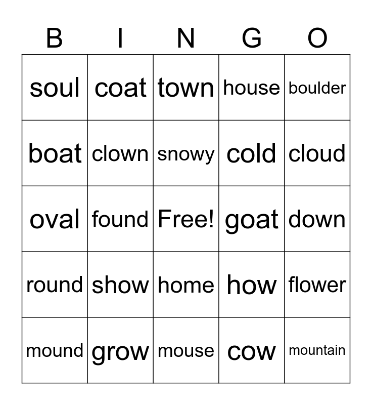 This bingo card has a free space and 24 words: show, grow, snowy, mound, boulder, soul, boat, coat, goat, home, cold, oval, how, flower, clown, cow, down, town, cloud, found, mountain, round, house and mouse.