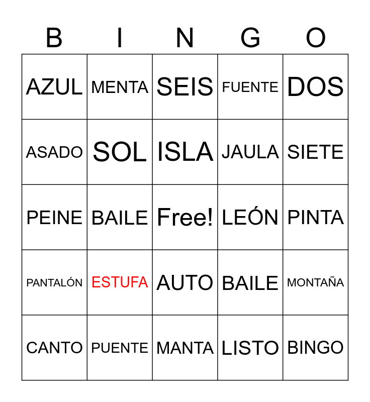 This bingo card has a free space and 25 words: ESTUFA, MANTA, ISLA, CANTO, DOS, AZUL, ASADO, MENTA, LEÓN, AUTO, JAULA, PEINE, BAILE, MONTAÑA, SOL, TINTA, PINTA, SEIS, SIETE, BAILE, BINGO, PUENTE, PANTALÓN, FUENTE and LISTO.