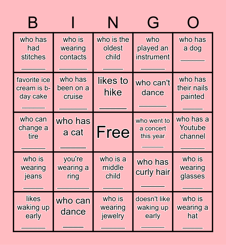 This bingo card has a free space and 24 words: likes waking up early ______, you're wearing a ring ________, likes to hike _____, doesn't like waking up early ______, who has a dog ______, who has had stitches ______, who is wearing contacts _______, who is the oldest child _____, who went to a concert this year ______, who has a Youtube channel ______, who can change a tire ______, who has been on a cruise _______, who has curly hair _____, who is wearing glasses _____, favorite ice cream is b-day cake ______, who can dance ____, who is wearing jewelry ______, who played an instrument ______, who has their nails painted _____, who is wearing jeans _____, who has a cat _____, who is a middle child _____, who can't dance ______ and who is wearing a hat _____.