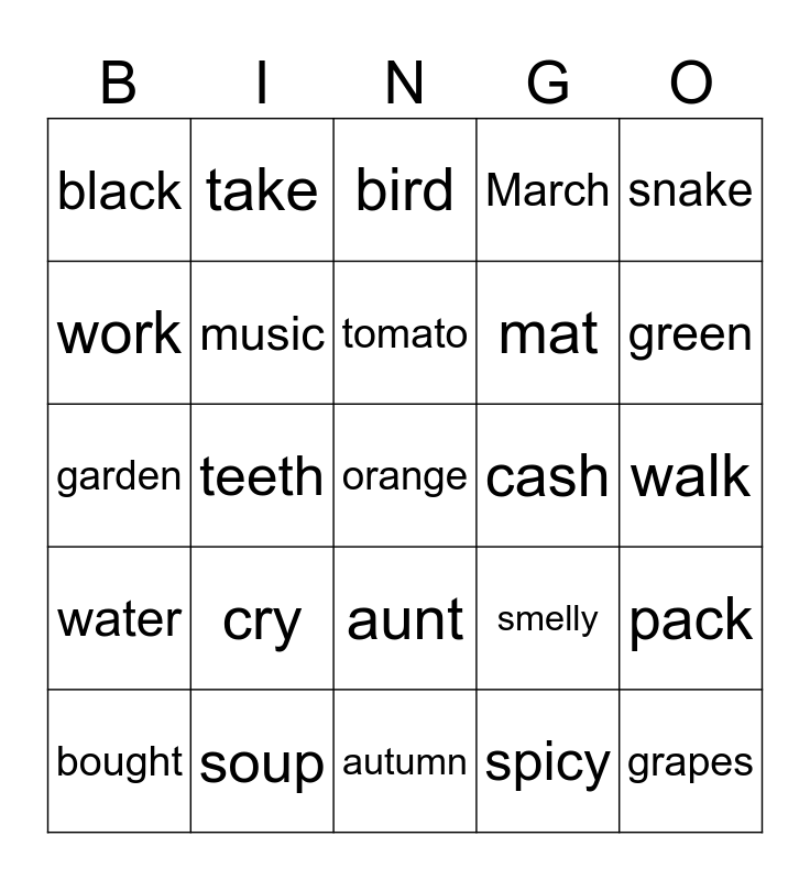 This bingo card has a free space and 24 words: cry, soup, tomato, bought, snake, black, work, take, cash, aunt, mat, garden, smelly, pack, music, spicy, walk, bird, green, teeth, grapes, water, March and autumn.