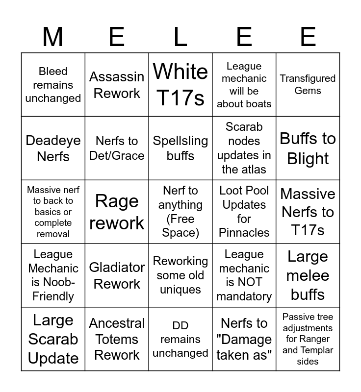 This bingo card has a free space and 24 words: Gladiator Rework, Ancestral Totems Rework, Spellsling buffs, Large Scarab Update, Transfigured Gems, Bleed remains unchanged, Deadeye Nerfs, Assassin Rework, Loot Pool Updates for Pinnacles, Reworking some old uniques, Scarab nodes updates in the atlas, Massive nerf to back to basics or complete removal, League mechanic is NOT mandatory, Large melee buffs, Nerfs to Det/Grace, Nerfs to "Damage taken as", Massive Nerfs to T17s, White T17s, Buffs to Blight, Rage rework, Passive tree adjustments for Ranger and Templar sides, League Mechanic is Noob-Friendly, League mechanic will be about boats and DD remains unchanged.