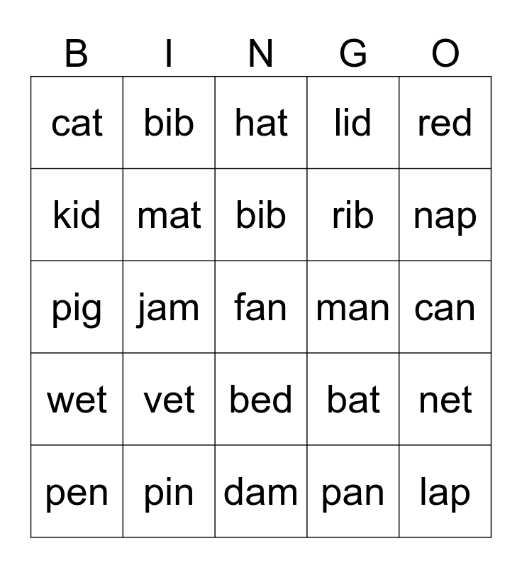 This bingo card has a free space and 31 words: dam, ham, jam, ram, cat, hat, mat, bat, man, pan, can, lap, cap, map, nap, jet, net, vet, wet, bed, red, hen, pen, bib, rib, kid, lid, pig, pin, bib and wig.