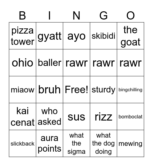 This bingo card has a free space and 24 words: slickback, who asked, rawr, what the dog doing, the goat, pizza tower, gyatt, ayo, sturdy, bingchilling, miaow, baller, rizz, bomboclat, ohio, aura points, what the sigma, skibidi, rawr, kai cenat, bruh, sus, rawr and mewing.