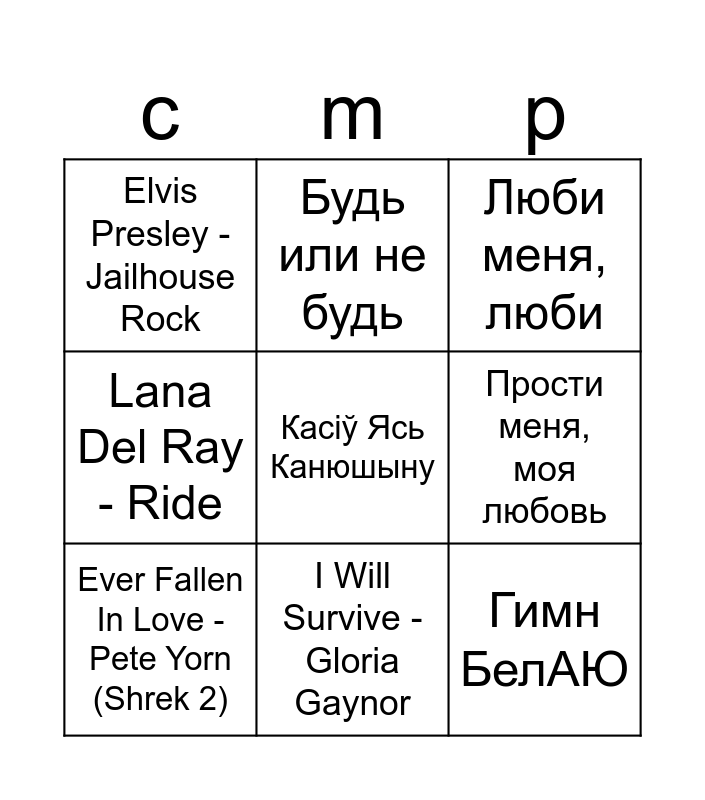 This bingo card has 9 words: Ever Fallen In Love - Pete Yorn (Shrek 2), Люби меня, люби, Будь или не будь, Lana Del Ray - Ride, Elvis Presley - Jailhouse Rock, Прости меня, моя любовь, Касіў Ясь Канюшыну, Гимн БелАЮ and I Will Survive - Gloria Gaynor.