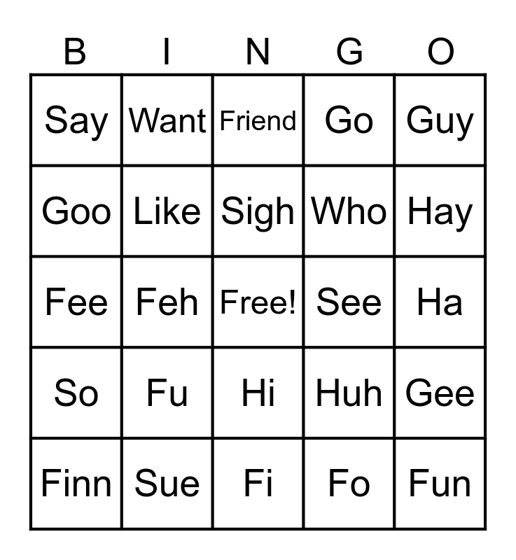 This bingo card has a free space and 24 words: Finn, Fu, Sigh, Fo, Guy, Say, Want, Friend, See, Ha, Fee, Like, Huh, Gee, Goo, Sue, Fi, Go, Hay, So, Feh, Hi, Who and Fun.