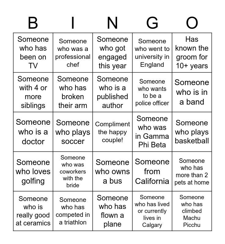 This bingo card has a free space and 24 words: Someone who was coworkers with the bride, Someone who has competed in a triathlon, Someone who is a published author, Someone who is really good at ceramics, Has known the groom for 10+ years, Someone who has been on TV, Someone with 4 or more siblings, Someone who was a professional chef, Someone who was in Gamma Phi Beta, Someone who owns a bus, Someone who wants to be a police officer, Someone who is a doctor, Someone from California, Someone who has more than 2 pets at home, Someone who has broken their arm, Someone who has lived or currently lives in Calgary, Someone who plays basketball, Someone who got engaged this year, Someone who is in a band, Someone who plays soccer, Someone who has climbed Machu Picchu, Someone who loves golfing, Someone who went to university in England and Someone who has flown a plane.