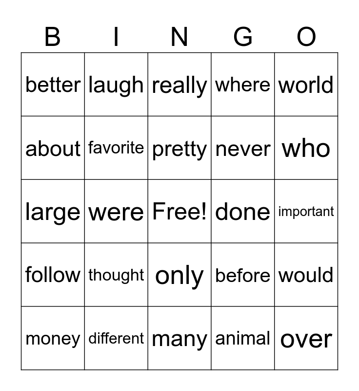 This bingo card has a free space and 25 words: thought, many, pretty, money, world, better, about, laugh, done, only, never, large, before, would, favorite, white, important, really, who, were, over, different, follow, where and animal.