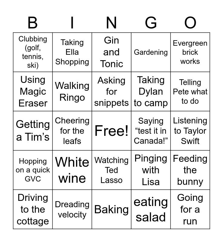 This bingo card has a free space and 24 words: White wine, Dreading velocity, Asking for snippets, Driving to the cottage, Evergreen brick works, Clubbing (golf, tennis, ski), Using Magic Eraser, Taking Ella Shopping, Saying “test it in Canada!”, Watching Ted Lasso, Taking Dylan to camp, Getting a Tim’s, Pinging with Lisa, Feeding the bunny, Walking Ringo, eating salad, Listening to Taylor Swift, Gin and Tonic, Telling Pete what to do, Cheering for the leafs, Going for a run, Hopping on a quick GVC, Gardening and Baking.