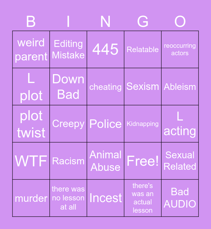 This bingo card has 25 words: Racism, Incest, cheating, murder, reoccurring actors, weird parent, L plot, Editing Mistake, Kidnapping, Animal Abuse, Sexism, plot twist, Free!, Sexual Related, Down Bad, Bad AUDIO, L acting, 445, Ableism, Creepy, Police, there was no lesson at all, WTF, Relatable and there's was an actual lesson.