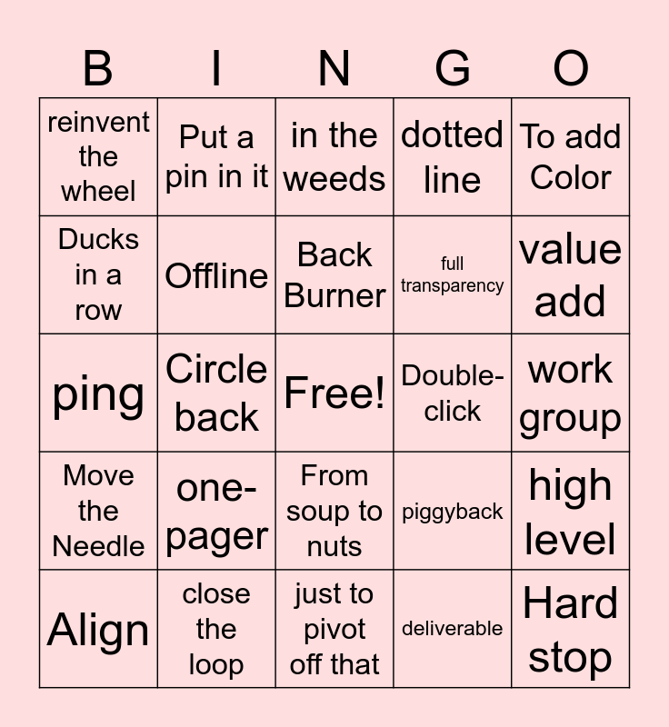 This bingo card has a free space and 33 words: Deep Dive, Get under the rock, Circle back, low-hanging fruit, Move the Needle, Offline, To add Color, Align, Put a pin in it, Bandwidth, Back Burner, in the weeds, to scale, subject matter expert, Double-click, value add, close the loop, ping, one-pager, piggyback, From soup to nuts, best practice, reinvent the wheel, work group, just to pivot off that, Hard stop, dotted line, full transparency, Ducks in a row, high level, business case, deliverable and pain point.