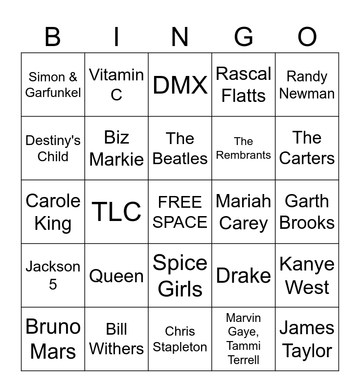This bingo card has a free space and 24 words: Queen, Bill Withers, The Beatles, Bruno Mars, Randy Newman, Simon & Garfunkel, Destiny's Child, Vitamin C, Mariah Carey, Spice Girls, The Rembrants, Carole King, Drake, Kanye West, Biz Markie, Marvin Gaye, Tammi Terrell, Garth Brooks, DMX, The Carters, TLC, James Taylor, Jackson 5, Rascal Flatts and Chris Stapleton.
