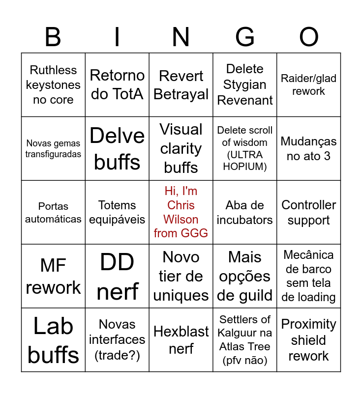 This bingo card has a free space and 24 words: DD nerf, Novas interfaces (trade?), Visual clarity buffs, Lab buffs, Raider/glad rework, Ruthless keystones no core, Novas gemas transfiguradas, Retorno do TotA, Aba de incubators, Novo tier de uniques, Delete scroll of wisdom (ULTRA HOPIUM), Portas automáticas, Mais opções de guild, Mecânica de barco sem tela de loading, Delve buffs, Settlers of Kalguur na Atlas Tree (pfv não), Controller support, Revert Betrayal, Mudanças no ato 3, Totems equipáveis, Proximity shield rework, MF rework, Delete Stygian Revenant and Hexblast nerf.