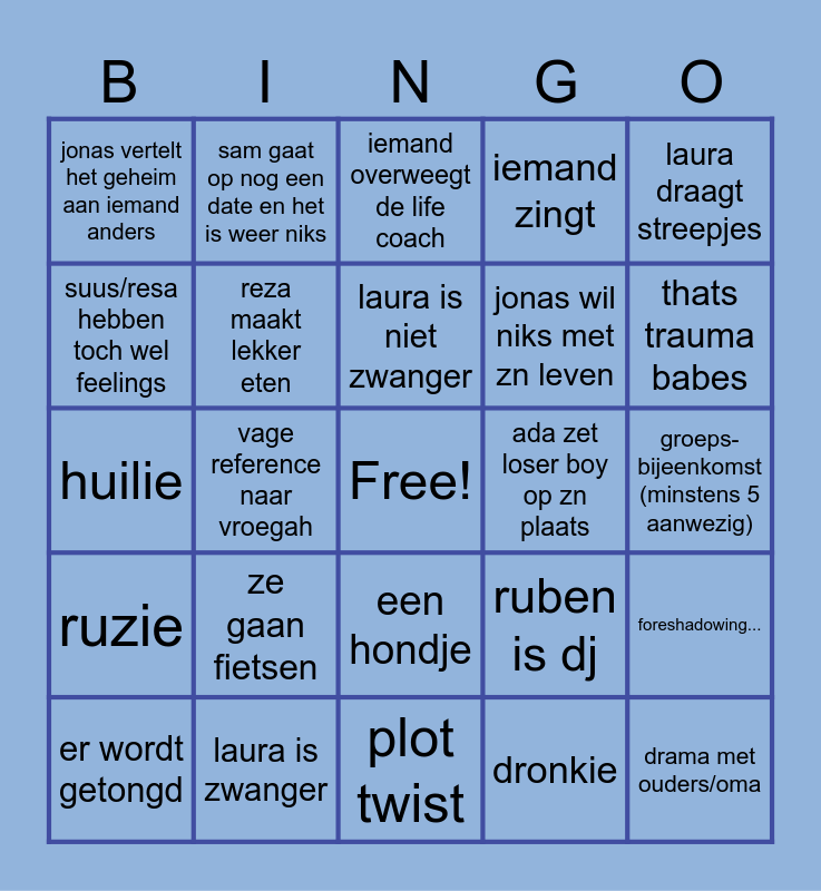 This bingo card has a free space and 24 words: ze gaan fietsen, laura is zwanger, laura is niet zwanger, er wordt getongd, laura draagt streepjes, jonas vertelt het geheim aan iemand anders, suus/resa hebben toch wel feelings, sam gaat op nog een date en het is weer niks, ada zet loser boy op zn plaats, een hondje, jonas wil niks met zn leven, huilie, ruben is dj, foreshadowing..., reza maakt lekker eten, dronkie, groeps-bijeenkomst (minstens 5 aanwezig), iemand overweegt de life coach, thats trauma babes, vage reference naar vroegah, drama met ouders/oma, ruzie, iemand zingt and plot twist.
