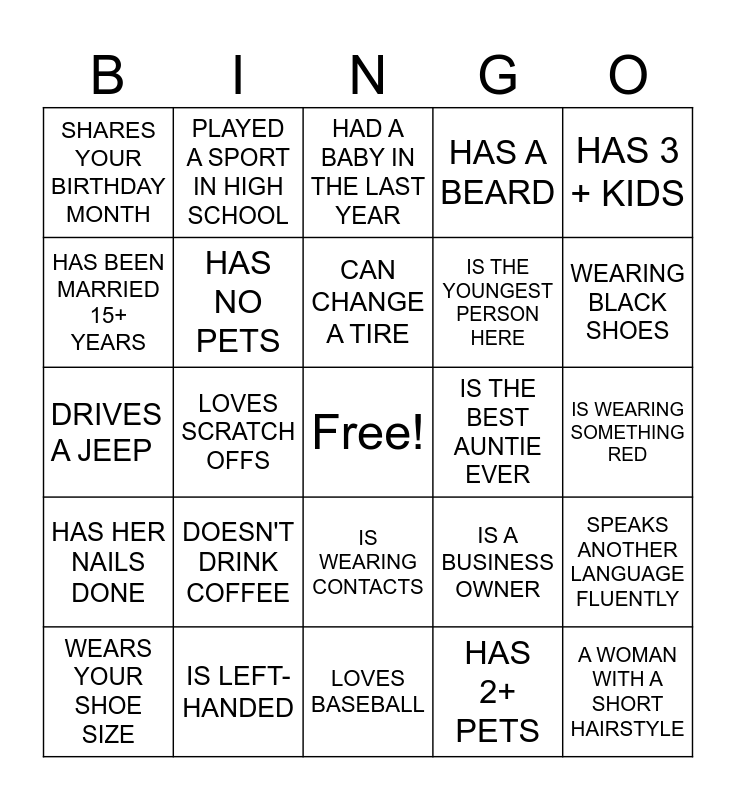 This bingo card has a free space and 24 words: DOESN'T DRINK COFFEE, IS LEFT- HANDED, CAN CHANGE A TIRE, WEARS YOUR SHOE SIZE, HAS 3 + KIDS, SHARES YOUR BIRTHDAY MONTH, HAS BEEN MARRIED 15+ YEARS, PLAYED A SPORT IN HIGH SCHOOL, IS THE BEST AUNTIE EVER, IS WEARING CONTACTS, IS THE YOUNGEST PERSON HERE, DRIVES A JEEP, IS A BUSINESS OWNER, SPEAKS ANOTHER LANGUAGE FLUENTLY, HAS NO PETS, HAS 2+ PETS, IS WEARING SOMETHING RED, HAD A BABY IN THE LAST YEAR, WEARING BLACK SHOES, LOVES SCRATCH OFFS, A WOMAN WITH A SHORT HAIRSTYLE, HAS HER NAILS DONE, HAS A BEARD and LOVES BASEBALL.