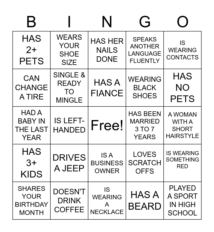 This bingo card has a free space and 24 words: DRIVES A JEEP, DOESN'T DRINK COFFEE, HAS A FIANCE, SHARES YOUR BIRTHDAY MONTH, IS WEARING CONTACTS, HAS 2+ PETS, CAN CHANGE A TIRE, WEARS YOUR SHOE SIZE, HAS BEEN MARRIED 3 TO 7 YEARS, IS A BUSINESS OWNER, WEARING BLACK SHOES, HAD A BABY IN THE LAST YEAR, LOVES SCRATCH OFFS, IS WEARING SOMETHING RED, SINGLE & READY TO MINGLE, HAS A BEARD, A WOMAN WITH A SHORT HAIRSTYLE, HAS HER NAILS DONE, HAS NO PETS, IS LEFT- HANDED, PLAYED A SPORT IN HIGH SCHOOL, HAS 3+ KIDS, SPEAKS ANOTHER LANGUAGE FLUENTLY and IS WEARING A NECKLACE.