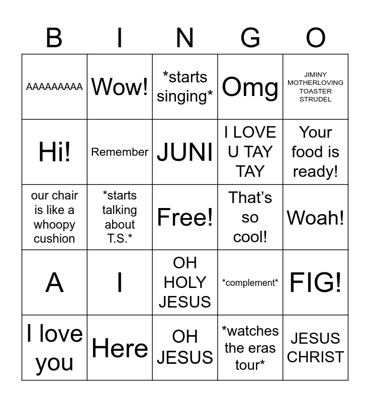 This bingo card has a free space and 29 words: Ok, Here, *starts singing*, Uh.., JIMINY MOTHERLOVING TOASTER STRUDEL, AAAAAAAAA, Remember, JUNI, That’s so cool!, FIG!, I love you, *starts talking about T.S.*, *watches the eras tour*, JESUS CHRIST, our chair is like a whoopy cushion, What the what?, OH JESUS, *complement*, Your food is ready!, A, I, Guess what?, I LOVE U TAY TAY, Woah!, Hi!, Wow!, OH HOLY JESUS, Omg and *curses*.
