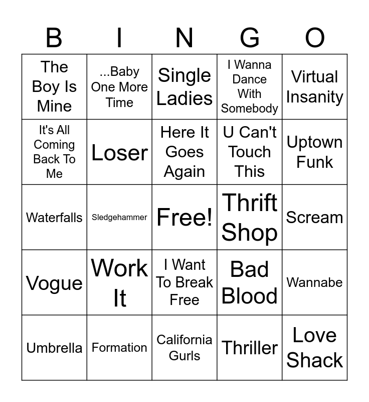 This bingo card has a free space and 32 words: Thriller, Take On Me, Sledgehammer, Rhythm Nation, Vogue, Loser, Virtual Insanity, Wannabe, ...Baby One More Time, Toxic, Here It Goes Again, Single Ladies, Bad Romance, Wrecking Ball, Thrift Shop, The Real Slim Shady, Umbrella, Waterfalls, I Want To Break Free, Work It, Bad Blood, Bye Bye Bye, Scream, Formation, Love Shack, I Wanna Dance With Somebody, U Can't Touch This, It's All Coming Back To Me, The Boy Is Mine, California Gurls, Hey Ya! and Uptown Funk.