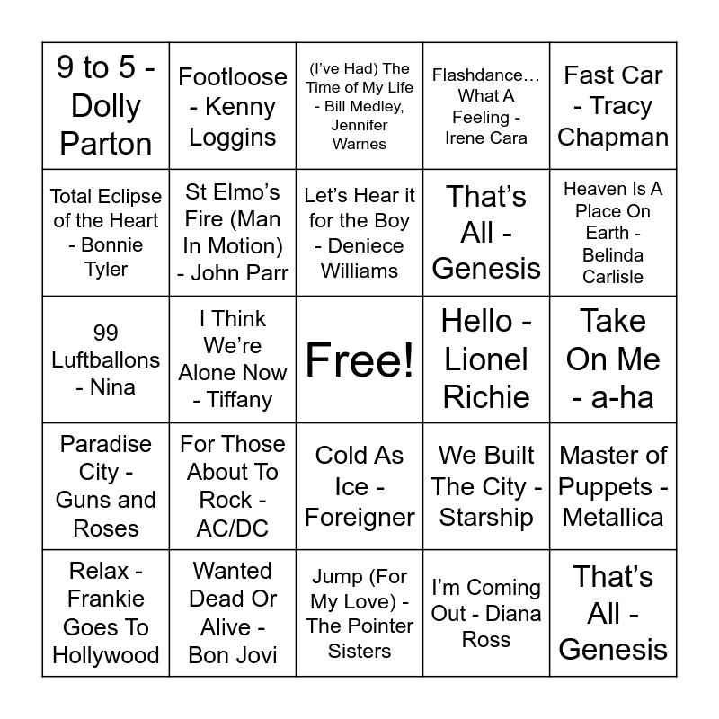 This bingo card has a free space and 75 words: I Wanna Dance With Someone - Whitney Huston, Jack & Diane - John Mellencamp, (I’ve Had) The Time of My Life - Bill Medley, Jennifer Warnes, Love Shack - B-52s, Gloria - Laura Branigan, Start Me Up - The Rolling Stones, It’s My Life - Talk Talk, Radio Gaga - Queen, Dancing In the Dark - Bruce Springsteen, Kiss - Prince, Open Your Heart - Madonna, Our House - Madness, Let’s Hear it for the Boy - Deniece Williams, Total Eclipse of the Heart - Bonnie Tyler, Girls Just Want To Have Fun - Cyndi Lauper, I Think We’re Alone Now - Tiffany, Don’t Stop Believin’ - Journey, That’s All - Genesis, Africa - Toto, Fast Car - Tracy Chapman, Bad - Michael Jackson, 99 Luftballons - Nina, St Elmo’s Fire (Man In Motion) - John Parr, Footloose - Kenny Loggins, Flashdance…What A Feeling - Irene Cara, The Best - Tina Turner, Drive - The Cars, Walking On Sunshine - Katrina & The Waves, In Your Eyes - Peter Gabriel, Careless Whisper - George Michael, I Want A New Drug - Huey Lewis & The News, Private Eyes - Daryl Hall & John Oates, Karma Chameleon - Culture Club, We Built The City - Starship, Heaven Is A Place On Earth - Belinda Carlisle, That’s All - Genesis, London Calling - The Clash, Hit Me With Your Best Shot - Pat Benatar, Take On Me - a-ha, I’m Coming Out - Diana Ross, Little Lies - Fleetwood Mac, Jessie’s Girl - Rick Springfield, Video Killed The Radio Star - The Buggles, Come On Eileen - Dexys Midnight Runners, Hungry Like The Wolf - Duran Duran, Here Comes the Rain Again - Eurythmics, Relax - Frankie Goes To Hollywood, 9 to 5 - Dolly Parton, Abracadabra - Steve Miller Band, Don’t You Want Me - The Human League, The Boys Of Summer - Don Henley, Cold As Ice - Foreigner, Need You Tonight - INXS, Venus - Bananarama, Atomic - Blondie, Wicked Game - Chris Isaak, About A Girl - Nirvana, Nothin’ But A Good Time - Poison, Closer To Fine - Indigo Girls, Don’t Dream It’s Over - Crowded House, For Those About To Rock - AC/DC, It’s Raining Men - The Weather Girls, Call Me - Blondie, Super Freak - Rick James, Smooth Operator - Sade, Hello - Lionel Richie, And She Was - Talking Heads, Dancing With Myself - Generation X, We’re Not Gonna Take It - Twisted Sister, Master of Puppets - Metallica, Paradise City - Guns and Roses, Wanted Dead Or Alive - Bon Jovi, Jump - Van Halen, Jump (For My Love) - The Pointer Sisters and If Looks Could Kill - Heart.