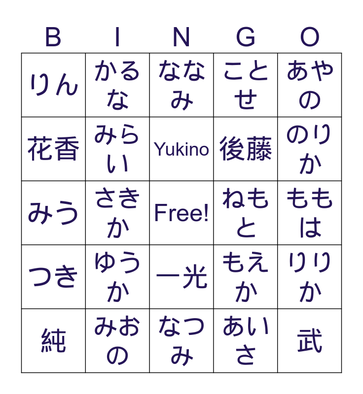 This bingo card has a free space and 24 words: 純, ゆうか, Yukino, あいさ, あやの, りん, かるな, ななみ, ねもと, ももは, みう, みらい, もえか, りりか, 花香, みおの, なつみ, ことせ, のりか, つき, さきか, 一光, 後藤 and 武.