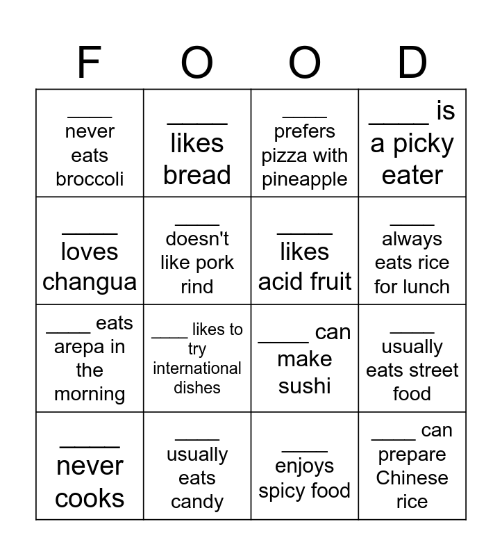 This bingo card has 24 words: ____ likes mushroom, ____ doesn't like vegetables, ____ always eats rice for lunch, ____ can cook ajiaco well, ____ loves changua, ____ never eats broccoli, ____ doesn't like pork rind, ____ likes bread, ____ usually eats candy, ____ is on a diet, ____ eats arepa in the morning, ____ can make sushi, ____ can make desserts, ____ never eats candy, ____ likes acid fruit, ____ loves Greek yogurt, ____ enjoys spicy food, ____ prefers pizza with pineapple, ____ likes to try international dishes, ____ usually eats street food, ____ never cooks, ____ can prepare Chinese rice, ____ is a picky eater and ____ drinks juice without sugar.