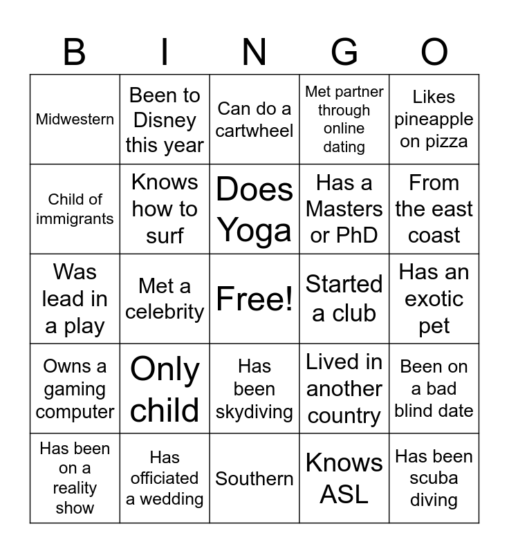 This bingo card has a free space and 32 words: Knows ASL, Appeared in a movie, Met a celebrity, Went viral online, Owns a gaming computer, Knows how to surf, Likes pineapple on pizza, Been on a bad blind date, Been to Disney this year, Loves roller coasters, Does Yoga, Can do a cartwheel, Rides horses, Knows martial arts, Started a club, Attended a concert this year, Has been on a reality show, Was lead in a play, Has been skydiving, Only child, Lived in another country, Plays an instrument, Has an exotic pet, Has officiated a wedding, Has been scuba diving, Met partner through online dating, Has a Masters or PhD, Child of immigrants, Midwestern, Southern, From the west coast and From the east coast.