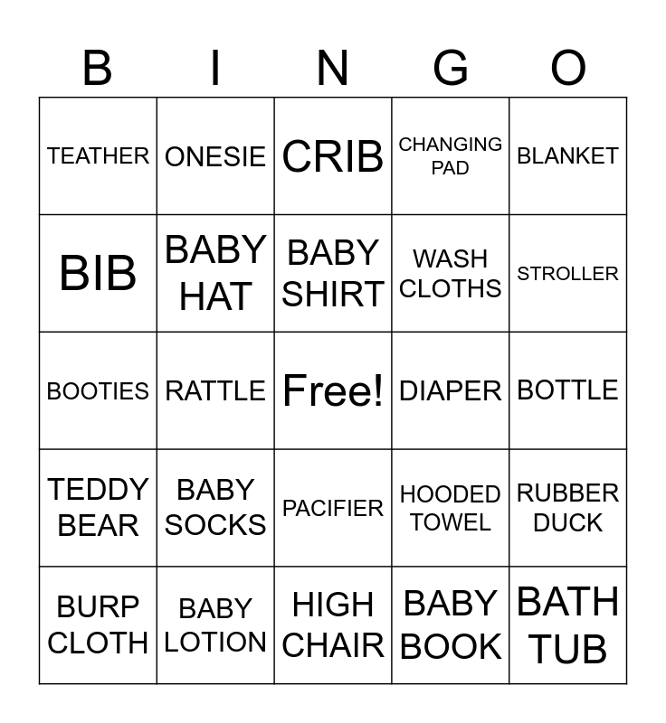 This bingo card has a free space and 24 words: BABY SOCKS, BABY LOTION, BABY SHIRT, BURP CLOTH, BLANKET, TEATHER, BIB, ONESIE, DIAPER, PACIFIER, WASH CLOTHS, BOOTIES, HOODED TOWEL, RUBBER DUCK, BABY HAT, BABY BOOK, BOTTLE, CRIB, STROLLER, RATTLE, BATH TUB, TEDDY BEAR, CHANGING PAD and HIGH CHAIR.