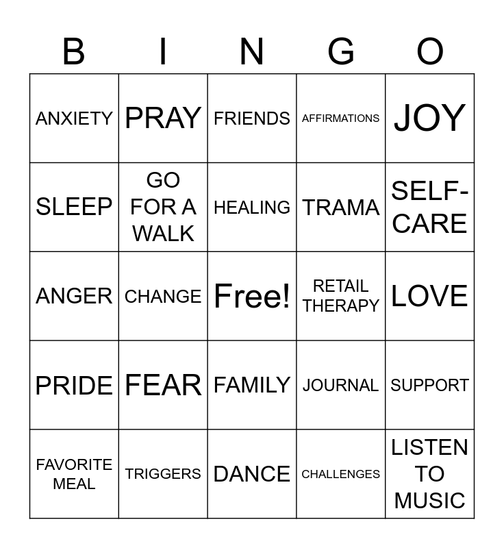 This bingo card has a free space and 24 words: FEAR, TRIGGERS, HEALING, FAVORITE MEAL, JOY, ANXIETY, SLEEP, PRAY, RETAIL THERAPY, FAMILY, TRAMA, ANGER, JOURNAL, SUPPORT, GO FOR A WALK, CHALLENGES, LOVE, FRIENDS, SELF- CARE, CHANGE, LISTEN TO MUSIC, PRIDE, AFFIRMATIONS and DANCE.