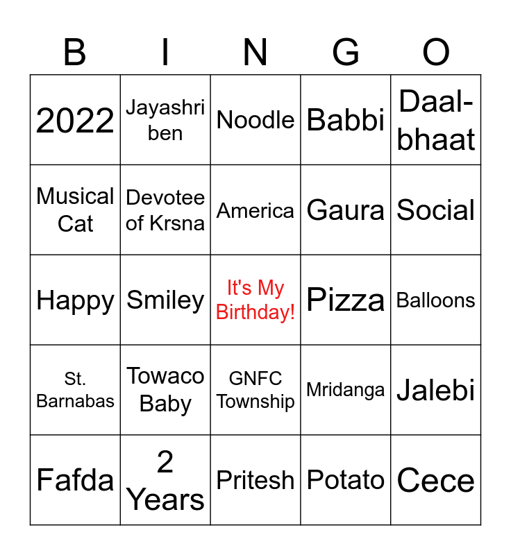 This bingo card has a free space and 54 words: Kartal, St. Barnabas, Handsome, Shantilal, GNFC Township, Roseland, Babbi, Anay, Musical Cat, Kumud ben, 2022, Undhiyu, 2 Years, Fafda, Vocal, Pritesh, Cece, Gaura, Livingston, Balloons, Mridanga, Radha-Krishna, Pizza, Daal-bhaat, Gifts, Jayashri ben, Cupcake, Bingo, JJ, Potato, Pasta, Cute, Friendly, July, Noodle, YoYo, Happy, Jalebi, Orange, Devotee of Krsna, Darshan, Piano, India, Nina, Towaco Baby, Birthday Party, Coco Melon, Radhe, America, Smiley, Social, Inquisitive, Motorcycle and Nitai.