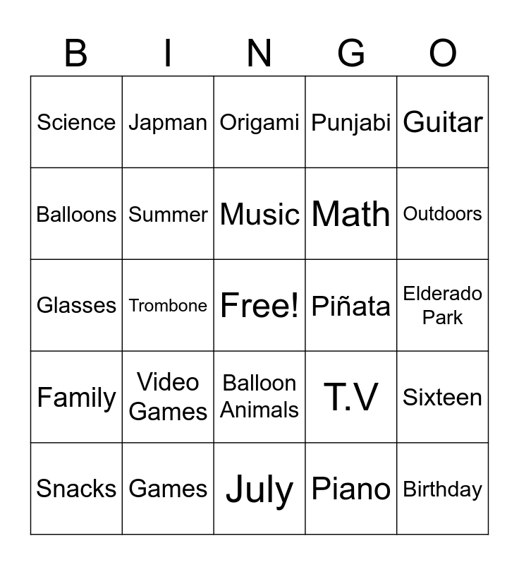 This bingo card has a free space and 42 words: Minecraft, Music, Trumpet, Video Games, Piano, Sixteen, Birthday, Cake, Origami, Balloon Animals, Elderado Park, Outdoors, Trombone, Guitar, Lightning McQueen, T.V, Youtube, Glasses, Teenager, Japman, Balloons, River, Trees, Science, Space, Dinosaurs, Math, Question, Creativity, Decorations, Party, Family, Summer, July, Years, Snacks, Games, Piñata, Student, Mario Kart, Punjabi and Boy.