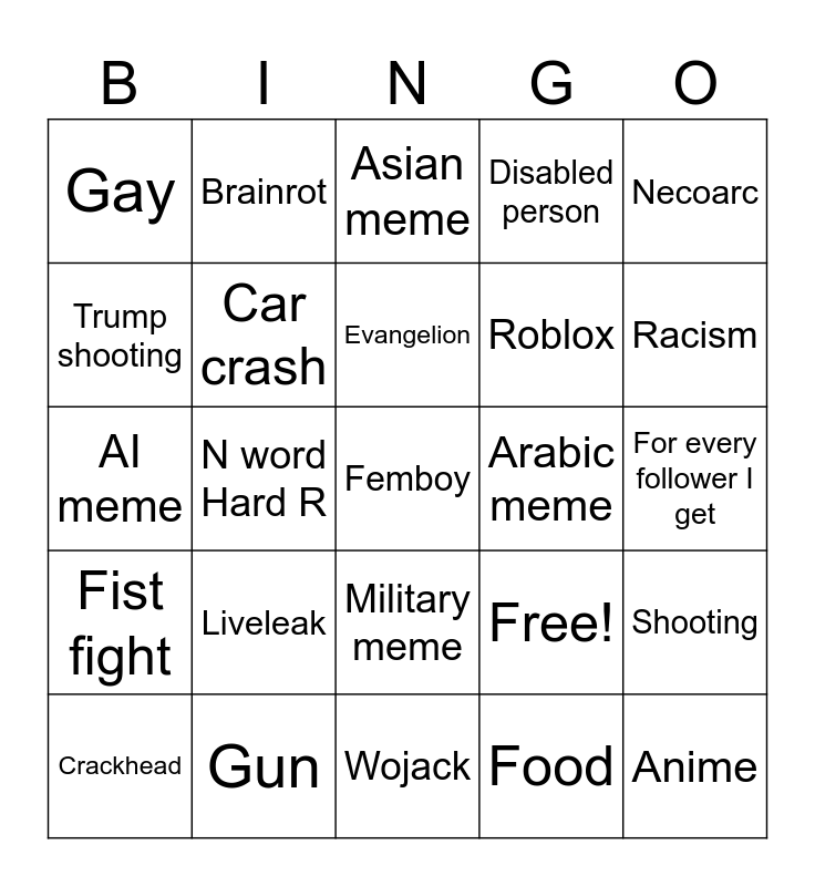 This bingo card has 25 words: Liveleak, Wojack, Evangelion, Crackhead, Necoarc, Gay, Trump shooting, Brainrot, Arabic meme, Military meme, Roblox, AI meme, Free!, Shooting, Car crash, Anime, For every follower I get, Asian meme, Racism, N word Hard R, Femboy, Gun, Fist fight, Disabled person and Food.