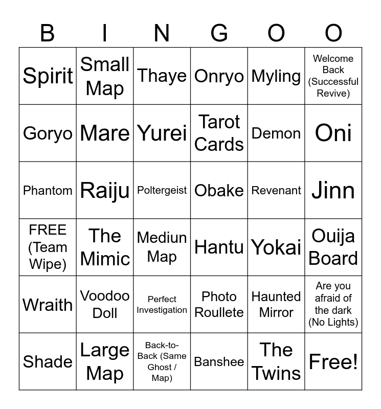 This bingo card has 41 words: Banshee, Demon, Deogen, Goryo, Hantu, Jinn, Mare, Moroi, Myling, Obake, Oni, Onryo, Phantom, Poltergeist, Raiju, Revenant, Shade, Spirit, The Twins, Thaye, The Mimic, Wraith, Yokai, Yurei, Free!, Haunted Mirror, Ouija Board, Summoning Circle, Tarot Cards, Voodoo Doll, Monkey Paw, Small Map, Mediun Map, Large Map, FREE (Team Wipe), Welcome Back (Successful Revive), Perfect Investigation, Are you afraid of the dark (No Lights), Back-to-Back (Same Ghost / Map), Photo Roullete and Zero Sanity..