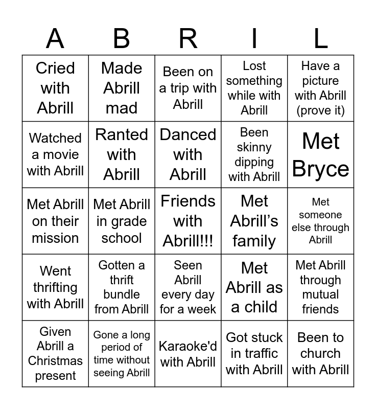 This bingo card has a free space and 27 words: Met Abrill as a child, Abrill has met their family, Been skinny dipping with Abrill, Karaoke'd with Abrill, Watched a movie with Abrill, Been on a trip with Abrill, Made Abrill mad, Went thrifting with Abrill, Met Abrill’s family, Met Abrill through mutual friends, Met Abrill on their mission, Lost something while with Abrill, Given Abrill a Christmas present, Gone a long period of time without seeing Abrill, Met Bryce, Been to a concert with Abrill, Ranted with Abrill, Danced with Abrill, Gotten a thrift bundle from Abrill, Cried with Abrill, Met someone else through Abrill, Got stuck in traffic with Abrill, Met Abrill in grade school, Been to church with Abrill, Seen Abrill every day for a week, Have a picture with Abrill (prove it) and Sent or gotten mail from Abrill.