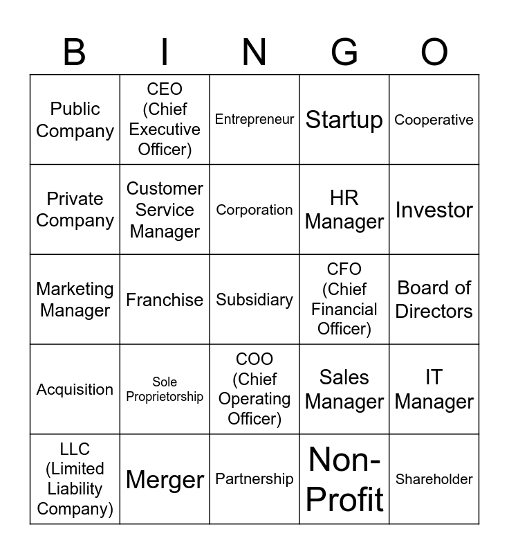 This bingo card has 25 words: Sole Proprietorship, Partnership, Corporation, LLC (Limited Liability Company), Cooperative, Public Company, Private Company, CEO (Chief Executive Officer), CFO (Chief Financial Officer), COO (Chief Operating Officer), HR Manager, Marketing Manager, Sales Manager, IT Manager, Customer Service Manager, Shareholder, Board of Directors, Entrepreneur, Investor, Franchise, Subsidiary, Merger, Acquisition, Startup and Non-Profit.