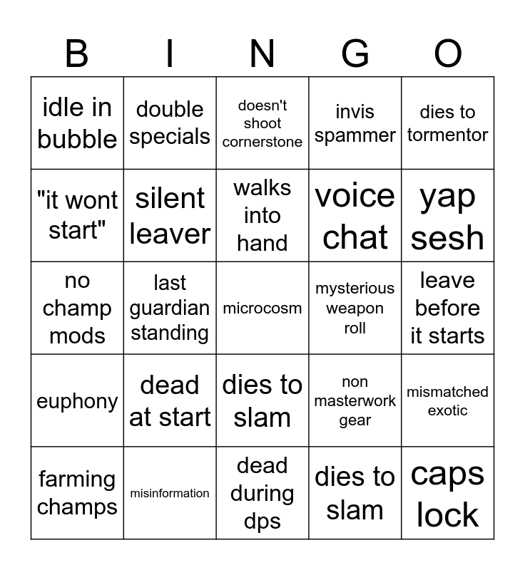 This bingo card has a free space and 25 words: dead at start, dead during dps, walks into hand, farming champs, dies to tormentor, idle in bubble, "it wont start", double specials, mysterious weapon roll, dies to slam, voice chat, no champ mods, non masterwork gear, mismatched exotic, silent leaver, unfunny name, leave before it starts, doesn't shoot cornerstone, yap sesh, last guardian standing, caps lock, misinformation, euphony, invis spammer and dies to slam.