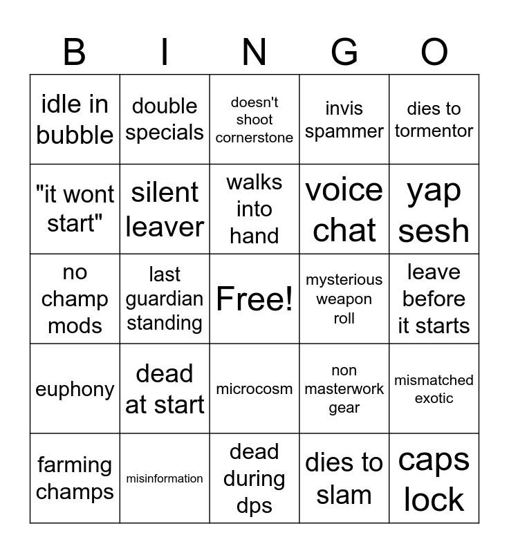 This bingo card has a free space and 25 words: dead at start, dead during dps, walks into hand, farming champs, dies to tormentor, idle in bubble, "it wont start", double specials, mysterious weapon roll, microcosm, voice chat, no champ mods, non masterwork gear, mismatched exotic, silent leaver, unfunny name, leave before it starts, doesn't shoot cornerstone, yap sesh, last guardian standing, caps lock, misinformation, euphony, invis spammer and dies to slam.