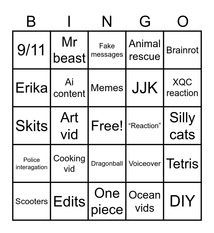 This bingo card has a free space and 24 words: Cooking vid, Edits, Memes, Scooters, Brainrot, 9/11, Erika, Mr beast, “Reaction”, Dragonball, JJK, Skits, Voiceover, Tetris, Ai content, Ocean vids, Silly cats, Fake messages, XQC reaction, Art vid, DIY, Police interagation, Animal rescue and One piece.