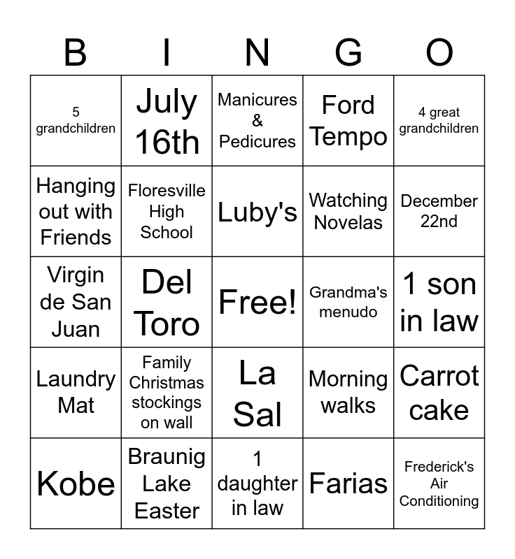 This bingo card has a free space and 29 words: Kobe, Crossword puzzles, Del Toro, "Tita", 5 grandchildren, Manicures & Pedicures, Floresville High School, Family Christmas stockings on wall, Grandma's menudo, Braunig Lake Easter, 1 son in law, Frederick's Air Conditioning, 1 daughter in law, Farias, December 22nd, Hair Rollers, La Sal, Laundry Mat, 4 great grandchildren, Virgin de San Juan, Morning walks, Midnight mass, Watching Novelas, Hanging out with Friends, Ford Tempo, July 16th, Carrot cake, Luby's and St. Anthony's Church.