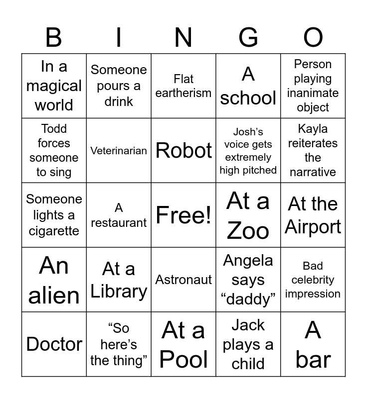 This bingo card has a free space and 39 words: Cheerleader, Teacher, Police, Veterinarian, Doctor, Astronaut, Robot, Person playing an animal, Person playing inanimate object, An alien, A restaurant, A school, A bar, At the Airport, At a Zoo, At a Library, Doctor’s office, In a magical world, Arthur changes accents mid-scene, Angela says “daddy”, Todd forces someone to sing, At a Pool, Josh’s voice gets extremely high pitched, Kayla reiterates the narrative, Arthur swaps accents mid-scene, Kayla plays a “cool teenager”, Jack plays a child, Bad celebrity impression, Shania Twain reference, Someone pours a drink, Chair used as something other than a chair, Good celebrity impression, Flat eartherism, “So here’s the thing”, Jack plays a child, Good celebrity impression, Bad celebrity impression, Someone lights a cigarette and Someone vapes.