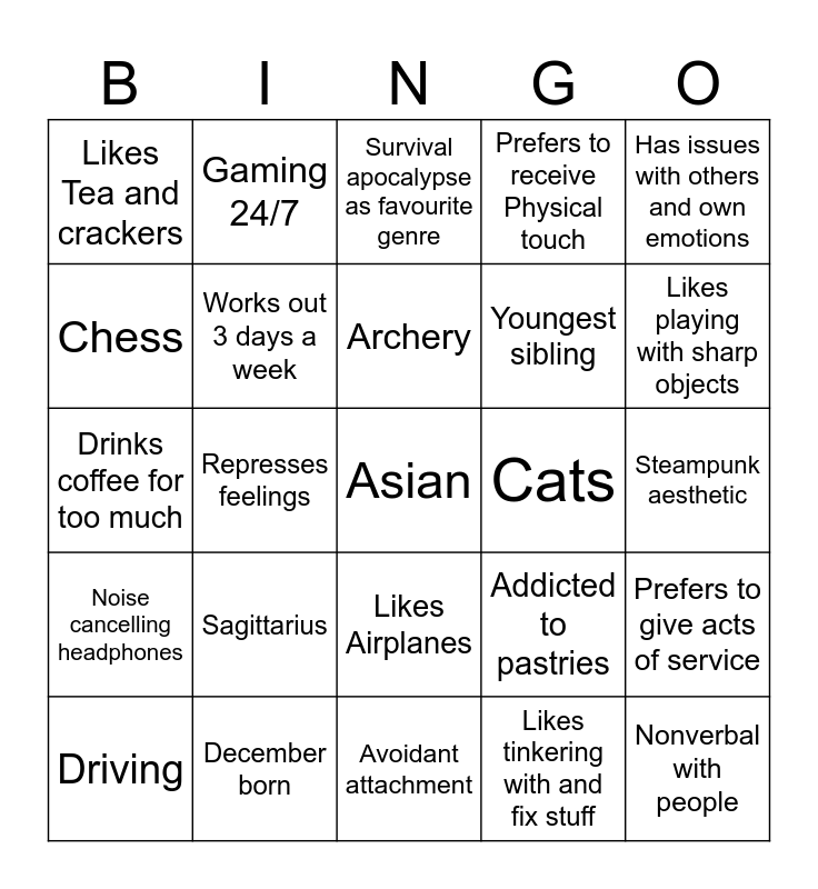This bingo card has a free space and 24 words: Sagittarius, December born, Archery, Driving, Has issues with others and own emotions, Likes Tea and crackers, Chess, Gaming 24/7, Cats, Likes Airplanes, Youngest sibling, Drinks coffee for too much, Addicted to pastries, Prefers to give acts of service, Works out 3 days a week, Likes tinkering with and fix stuff, Steampunk aesthetic, Survival apocalypse as favourite genre, Likes playing with sharp objects, Represses feelings, Nonverbal with people, Noise cancelling headphones, Prefers to receive Physical touch and Avoidant attachment.
