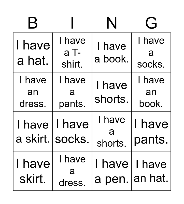 This bingo card has 16 words: I have a dress., I have pants., I have a book., I have a hat., I have a skirt., I have a T-shirt., I have a shorts., I have a pen., I have an dress., I have a pants., I have skirt., I have a socks., I have socks., I have an book., I have shorts. and I have an hat..