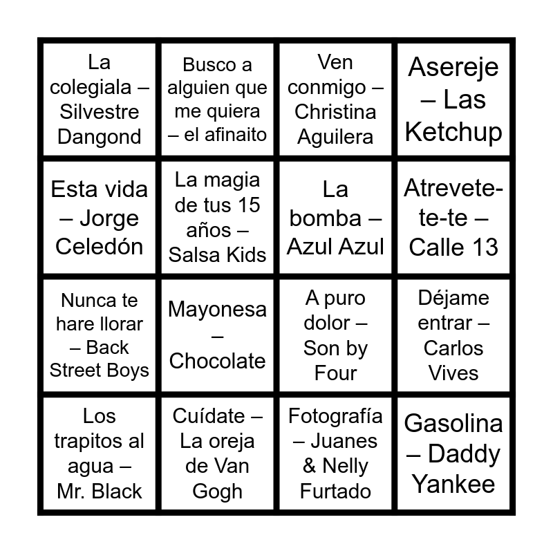 This bingo card has 23 words: Gasolina – Daddy Yankee, Pobre diabla – Don Omar, Atrevete-te-te – Calle 13, Vivo en el limbo – Kaleth Morales, Esta vida – Jorge Celedón, La colegiala – Silvestre Dangond, La magia de tus 15 años – Salsa Kids, Busco a alguien que me quiera – el afinaito, Los trapitos al agua – Mr. Black, La suegra voladora - Sayayin, Mayonesa – Chocolate, Nunca te hare llorar – Back Street Boys, Fruta Fresca – Carlos Vives, Tu – Shakira, Cuídate – La oreja de Van Gogh, No me voy – OV7, Ven conmigo – Christina Aguilera, A puro dolor – Son by Four, La bomba – Azul Azul, Déjame entrar – Carlos Vives, Asereje – Las Ketchup, Fotografía – Juanes & Nelly Furtado and Mariposa Traicionera – Mana.