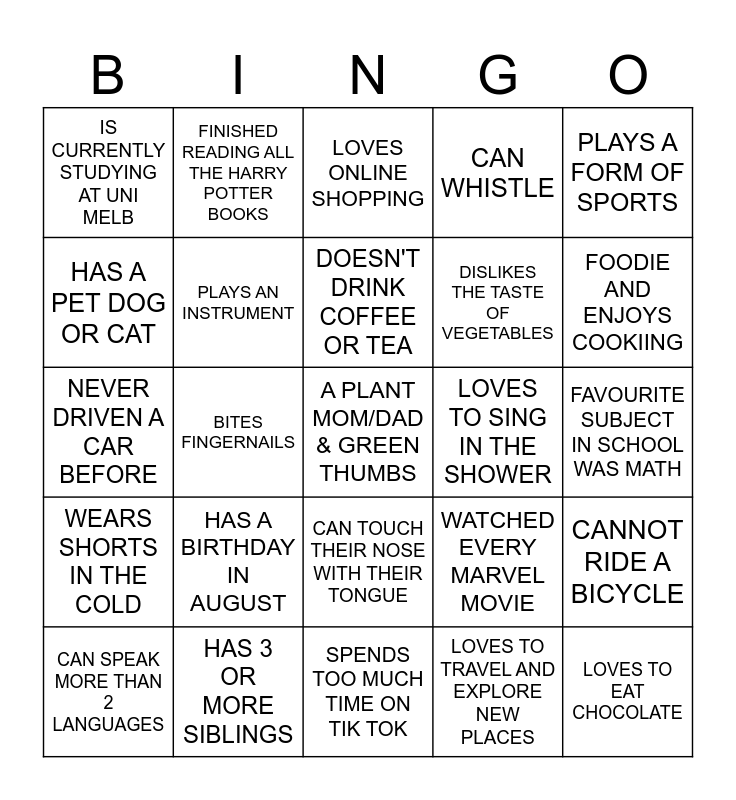 This bingo card has a free space and 24 words: HAS A BIRTHDAY IN AUGUST, HAS 3 OR MORE SIBLINGS, DOESN'T DRINK COFFEE OR TEA, CAN SPEAK MORE THAN 2 LANGUAGES, PLAYS A FORM OF SPORTS, IS CURRENTLY STUDYING AT UNI MELB, HAS A PET DOG OR CAT, FINISHED READING ALL THE HARRY POTTER BOOKS, LOVES TO SING IN THE SHOWER, CAN TOUCH THEIR NOSE WITH THEIR TONGUE, DISLIKES THE TASTE OF VEGETABLES, NEVER DRIVEN A CAR BEFORE, WATCHED EVERY MARVEL MOVIE, CANNOT RIDE A BICYCLE, PLAYS AN INSTRUMENT, LOVES TO TRAVEL AND EXPLORE NEW PLACES, FAVOURITE SUBJECT IN SCHOOL WAS MATH, LOVES ONLINE SHOPPING, FOODIE AND ENJOYS COOKIING, BITES FINGERNAILS, LOVES TO EAT CHOCOLATE, WEARS SHORTS IN THE COLD, CAN WHISTLE and SPENDS TOO MUCH TIME ON TIK TOK.