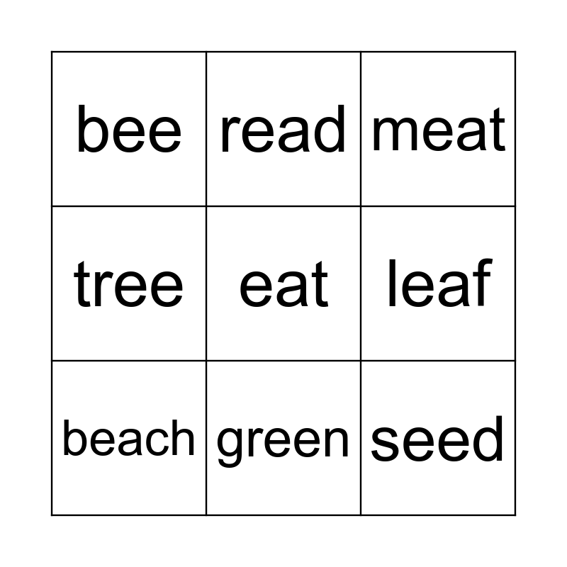 This bingo card has a free space and 8 words: leaf, meat, read, beach, bee, seed, tree and green.
