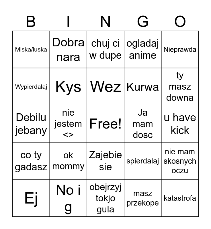 This bingo card has a free space and 24 words: ok mommy, No i g, Wez, Ej, Nieprawda, Miska/luska, Wypierdalaj, Dobra nara, Ja mam dosc, Zajebie sie, Kurwa, Debilu jebany, spierdalaj, nie mam skosnych oczu, Kys, masz przekope, u have kick, chuj ci w dupe, ty masz downa, nie jestem <>, katastrofa, co ty gadasz, ogladaj anime and obejrzyj tokjo gula.